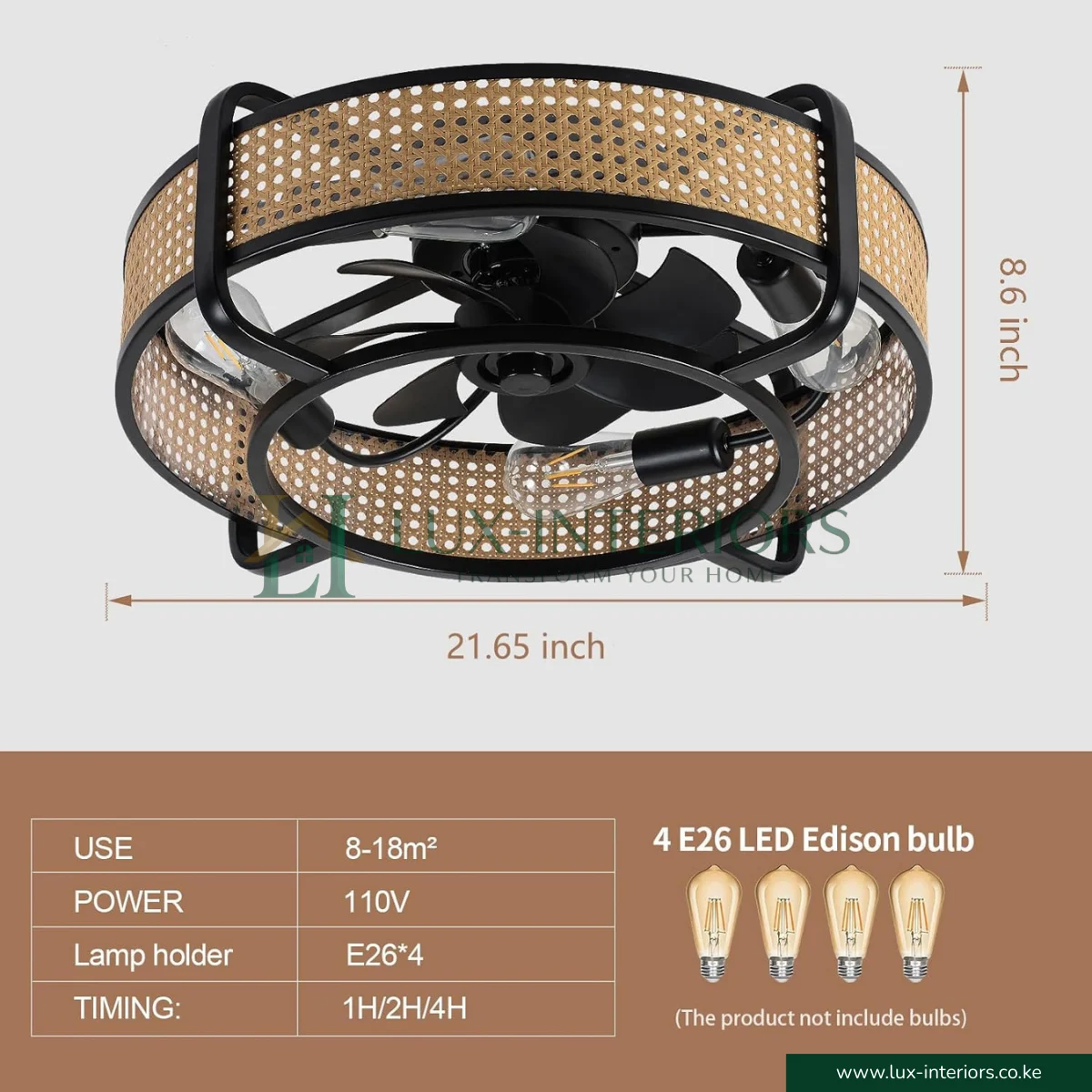 The included remote control offers convenient operation of fan speeds, lighting, and built-in timer settings, allowing you to create a comfortable environment without leaving your seat. It comes complete with E27 bulbs included, so it is ready for installation and immediate use.