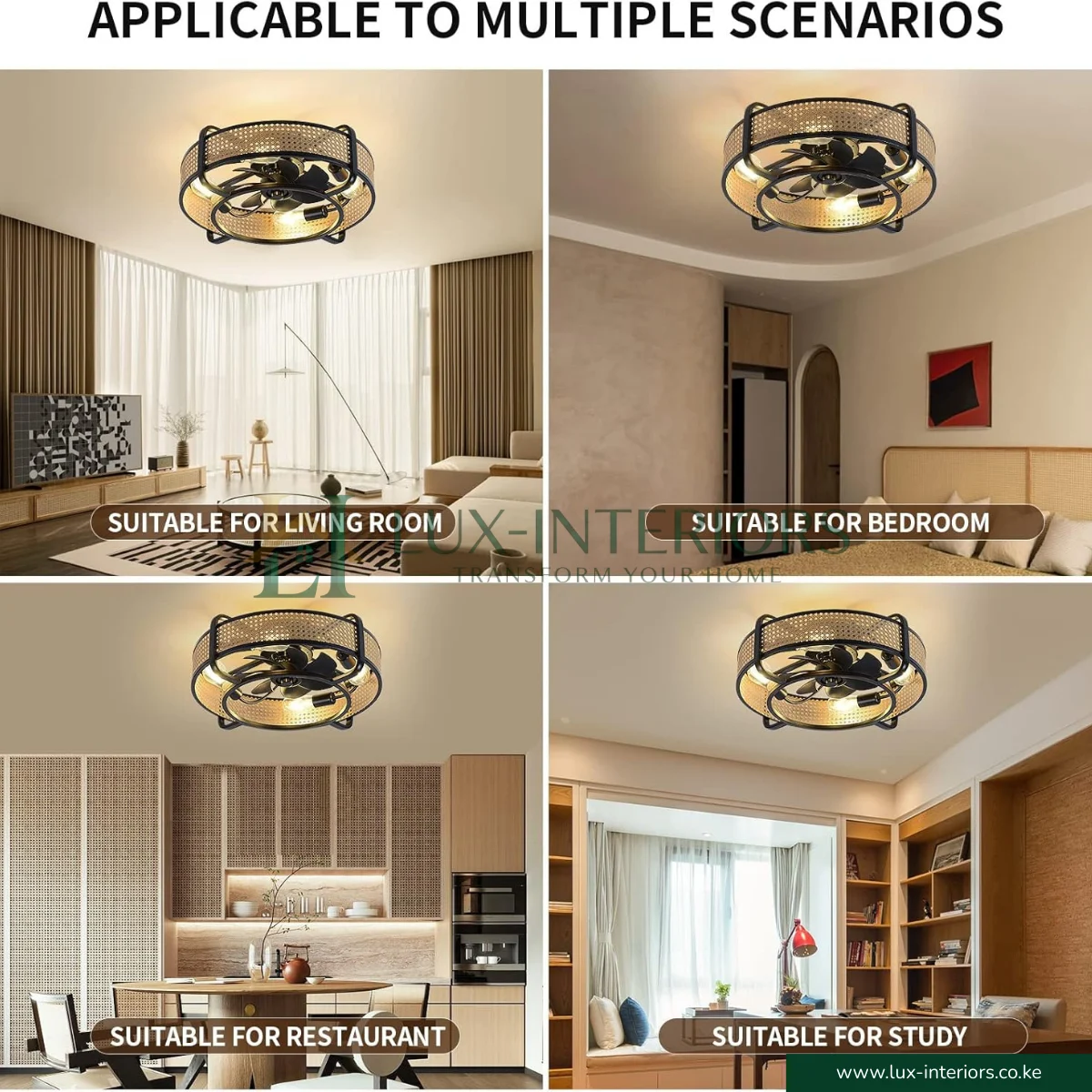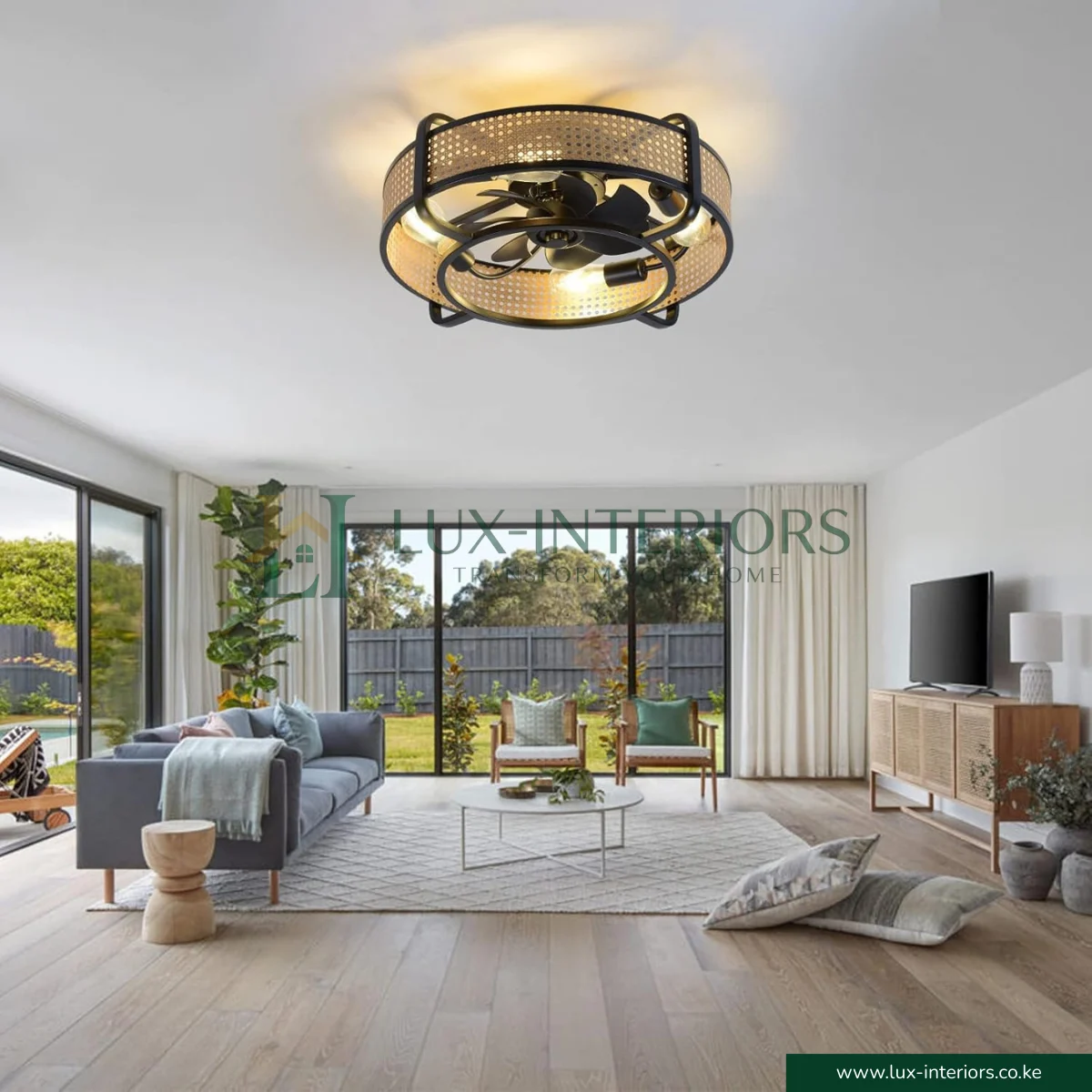 With compact dimensions of 21.65″ L × 21.65″ W × 8.6″ H, this ceiling fan is perfect for rooms with standard or lower ceilings, delivering efficient air circulation and ambient lighting in one elegant fixture.